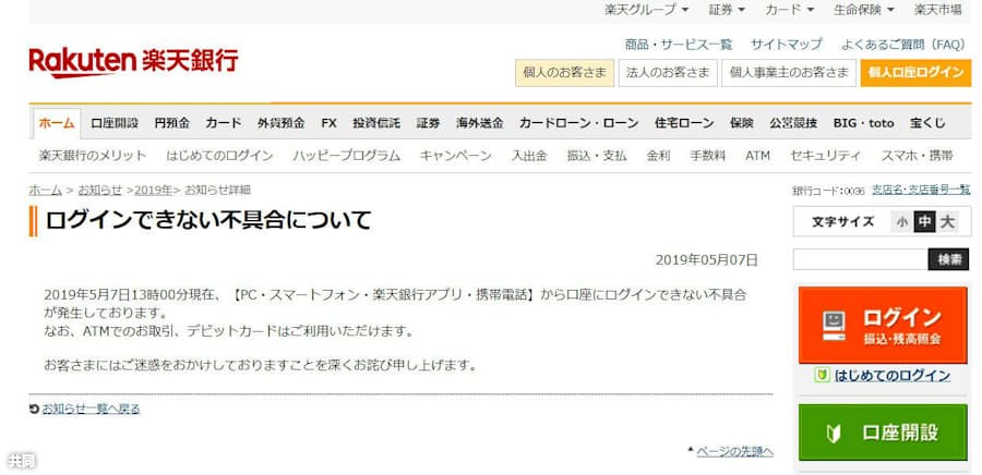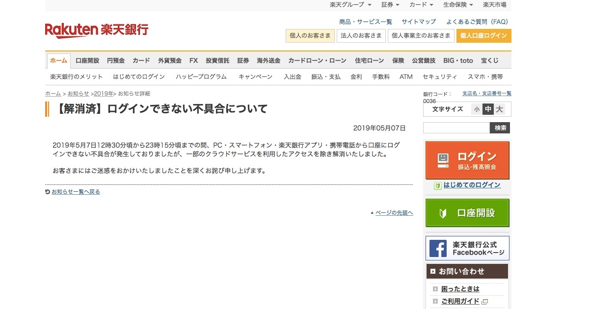 システム障害の解消を発表した楽天銀行のwebサイト 日経クロステック Xtech