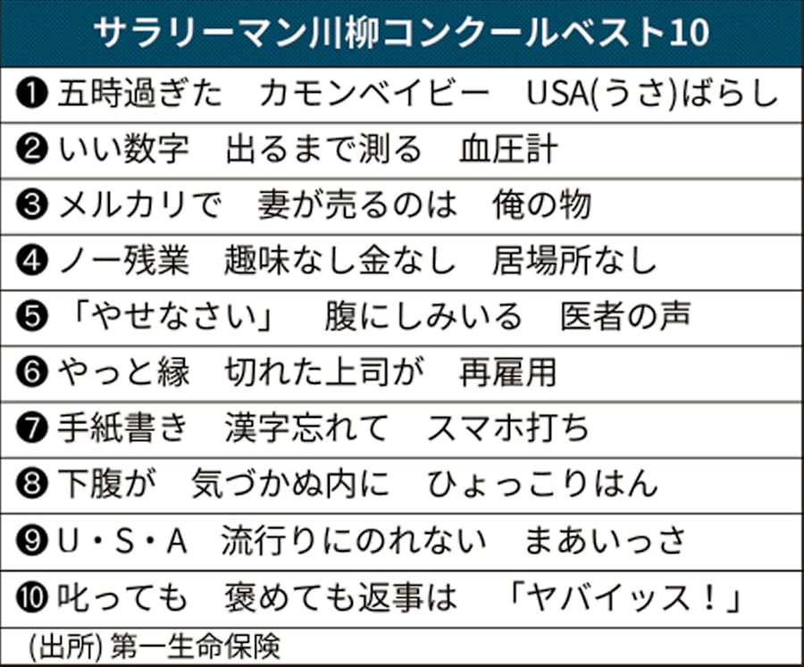 『サラリーマン川柳』優秀100選が決定 "生産性向上""働き方改革"意識する句が多数全句掲載 第一生命保険は15日、世の会社員たちの悲哀を.